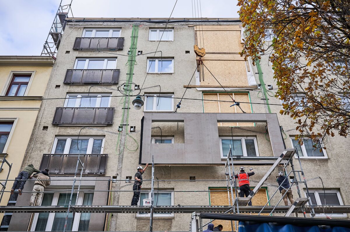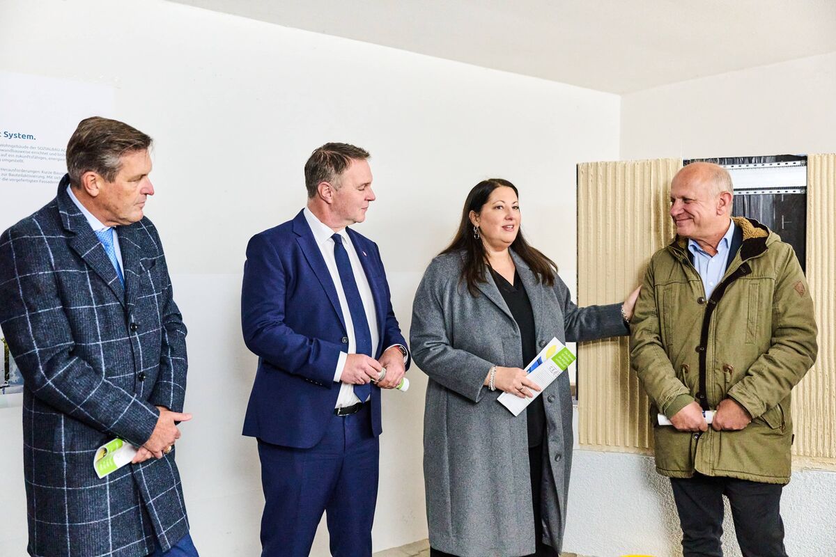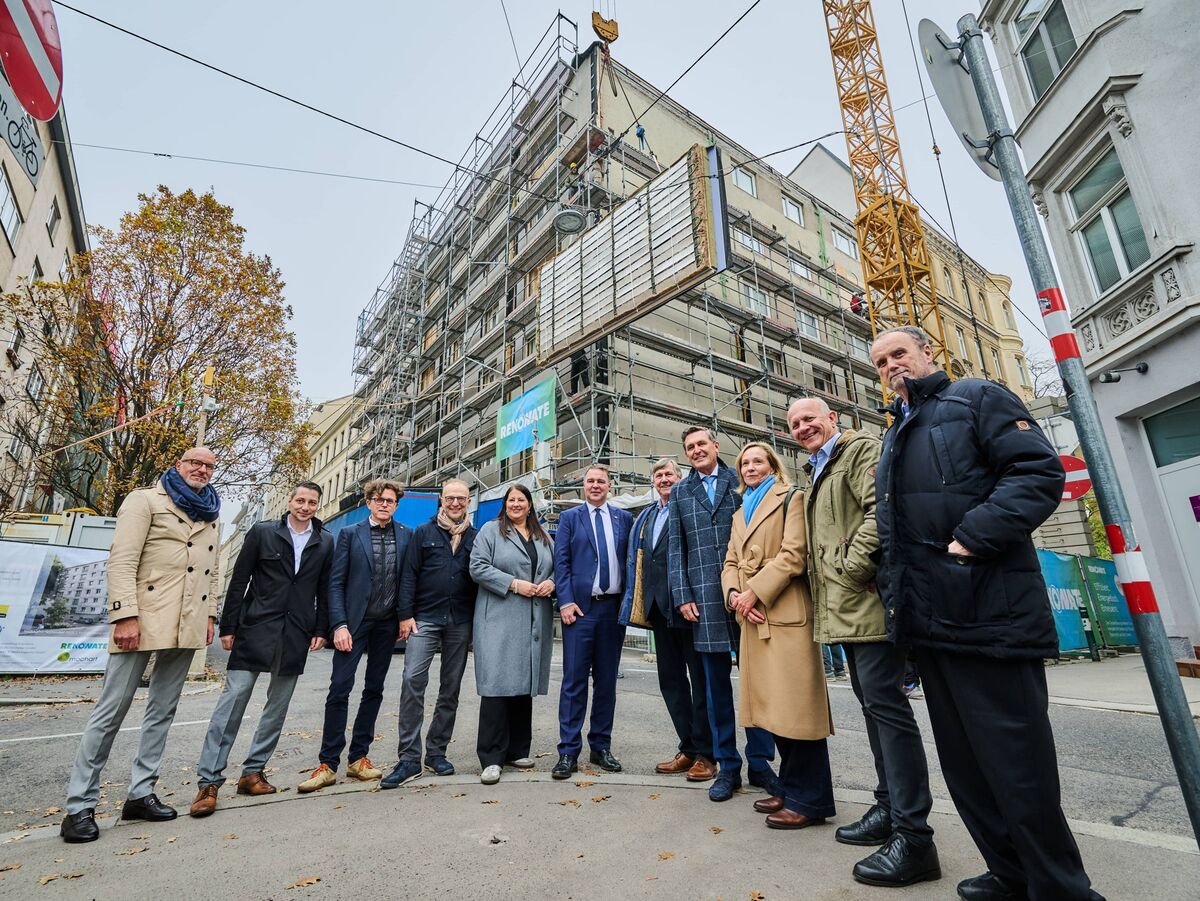 Großer Andrang herrschte am 12. November: Vizekanzler und Wohnminister Andreas Babler, Innovationsminister Peter Hanke, Wohnbaustadträtin Kathrin Gaál und Bezirksvorsteher Ernst Hohenberger Vizekanzler und Wohnminister Andreas Babler, Innovationsminister Peter Hanke, Wohnbaustadträtin Kathrin Gaál und Bezirksvorsteher Ernst Hohenberger machten sich vor Ort ein Bild von dem Sanierungsprojekt und konnten eine Live-Montage eines Fassadenmoduls beobachten.