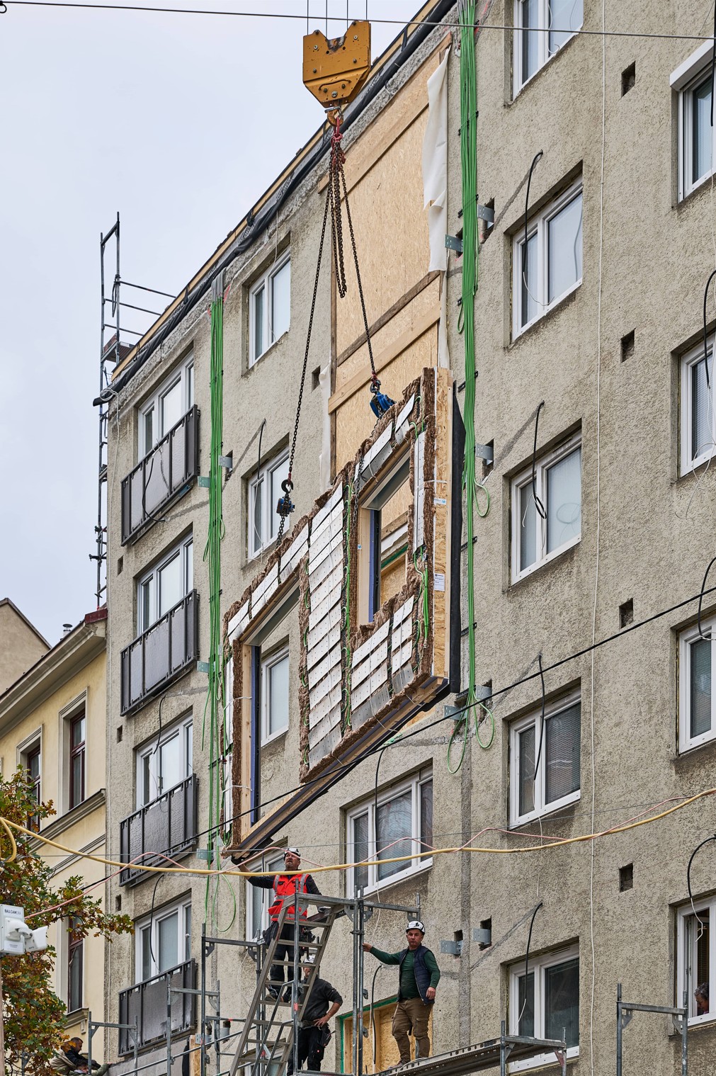 Daniela Huber, Hauptabteilungsleiter-Stellvertreterin und als Leiterin Energie & Innovation Projektverantwortliche der SOZIALBAU AG erklärt die Vorteile des seriellen Sanierungsprojektes: „Der zentrale Vorteil der Methode ‚Sanierung in Serie‘ liegt in der Geschwindigkeit der gesamten Projektumsetzung. Die Planungsphase benötigt aufgrund der Detailintensität etwas mehr Zeit, aber die Umsetzung vor Ort ist in nur acht Tagen erledigt und ist minimalinvasiv. Das bedeutet, keine Aussiedelung von Bewohner:innen, weniger Lärm, weniger Staub sowie so gut wie keinen Müll auf der Baustelle. Im Vergleich zu einer konventionellen Fassadensanierung mit Wärmedämmverbundsystem liegen die Kosten derzeit noch über einer konventionellen Sanierung. Diese Mehrkosten stehen jedoch in einem klaren Verhältnis zu den zusätzlichen Qualitäten: durch die Integration der Gebäudetechnik, die Möglichkeit zur sommerlichen Kühlung, den deutlich reduzierten Energieverbrauch und die längeren Erneuerungszyklen entsteht ein messbarer Mehrwert – ökologisch, wirtschaftlich und sozial. Wir sehen in der seriellen Sanierung ein zukunftsweisendes Instrument, um Sanierungen im großvolumigen Wohnbau zu beschleunigen, Komfort und Energieeffizienz zu steigern und so einen wichtigen Beitrag zur Erreichung der Klimaziele zu leisten.“