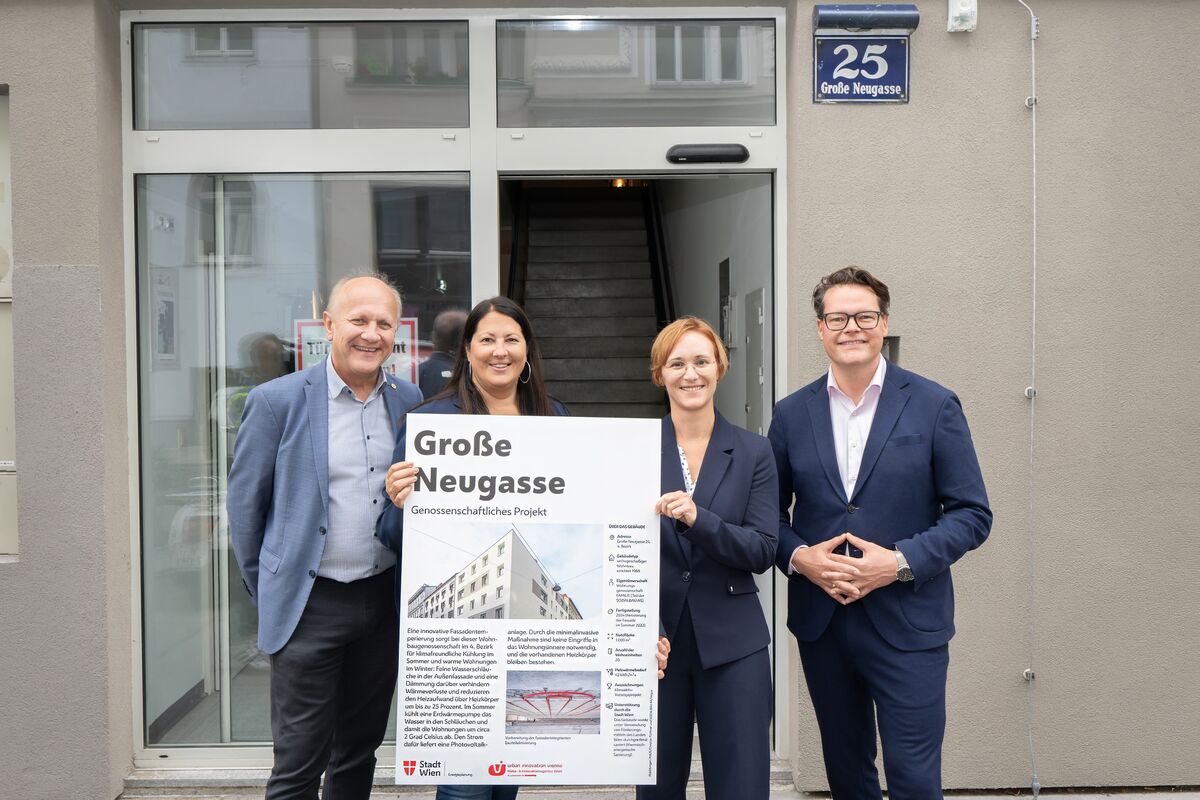 Großer Andrang herrschte am 18. September in der Großen Neugasse 25 auf der Wieden. Wohnbaustadträtin Kathrin Gaál, Klimastadtrat Jürgen Czernohorsky und Bezirksvorsteherin Lea Halbwidl sowie zahlreiche Medienvertreter:innen waren gekommen, um sich ein Bild über das innovative "Raus aus Gas"-Vorzeigeprojekt der Wohnungsgenossenschaft FAMILIE zu machen.